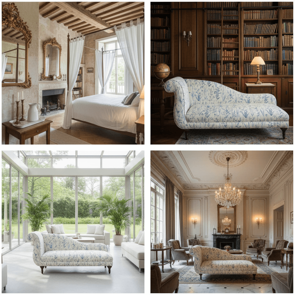 - Shown here is a chaise in Glacial Corn Yards Fabric.
